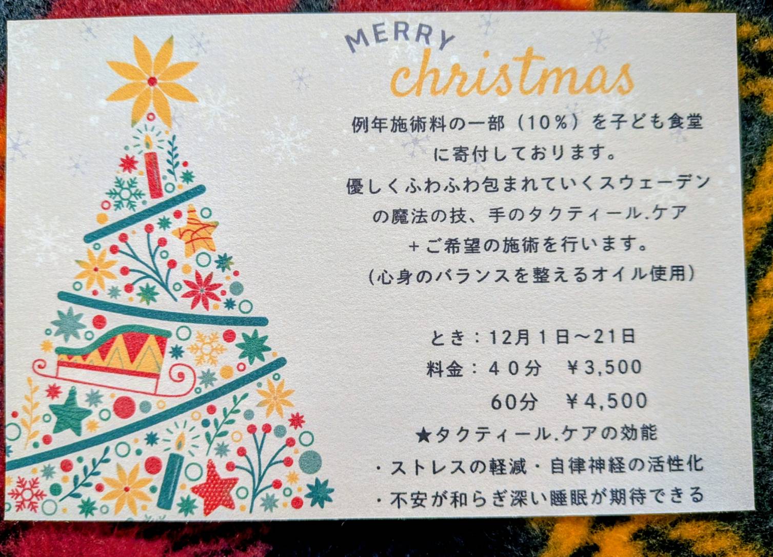 施術料の一部を子ども食堂に寄付致します。優しくふわふわ包まれていくスウェーデンの魔法の技、手のタクティール.ケア+ご希望の施術を行ないます